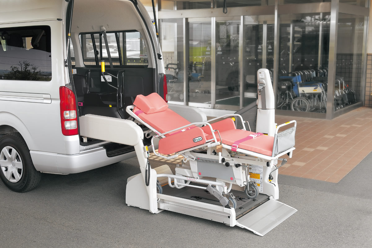 背上げ・昇降機能を備えたストレッチャーと、体圧分散性・座位保持能力に優れたフルリクライニング車いすをご用意。